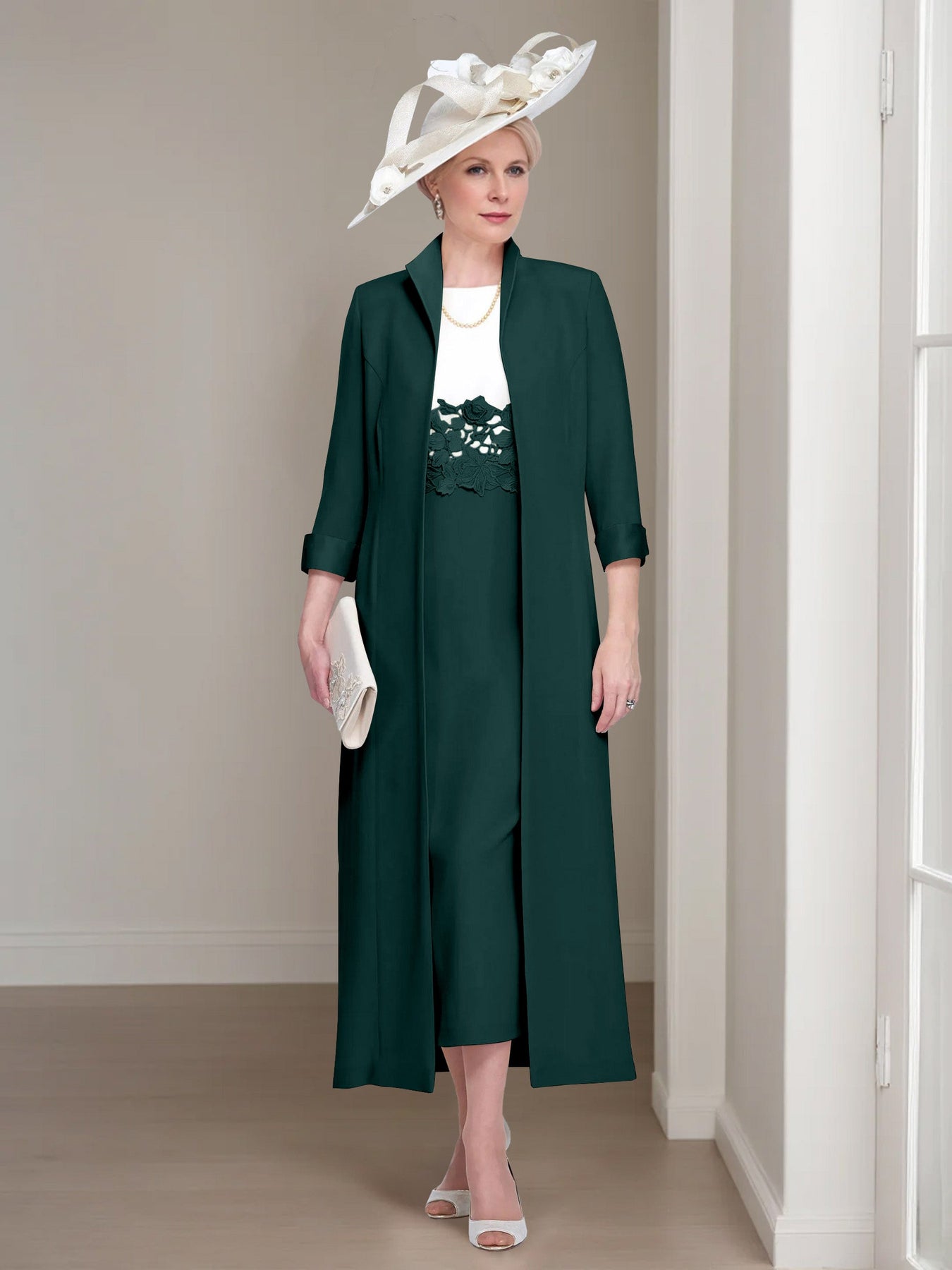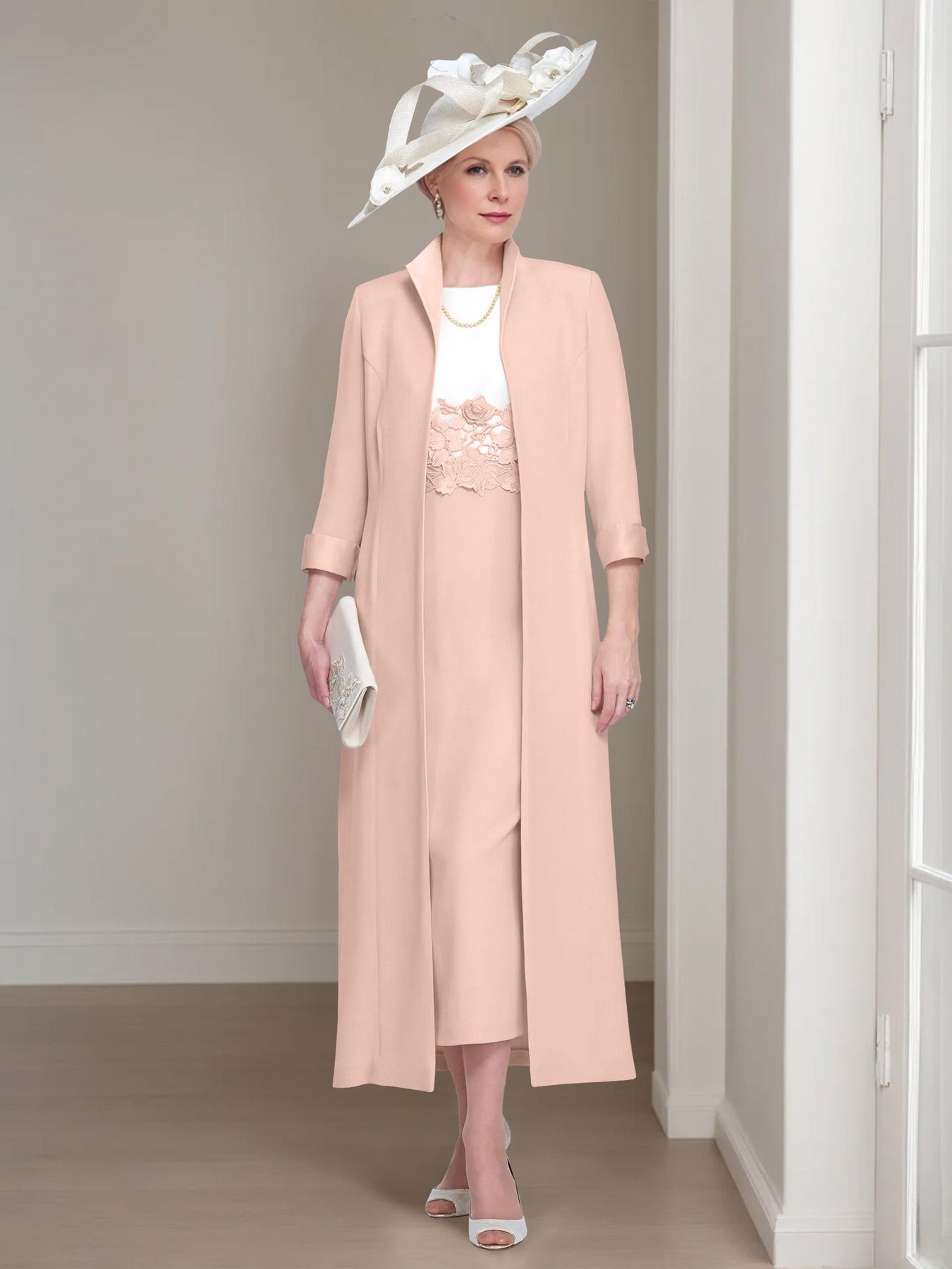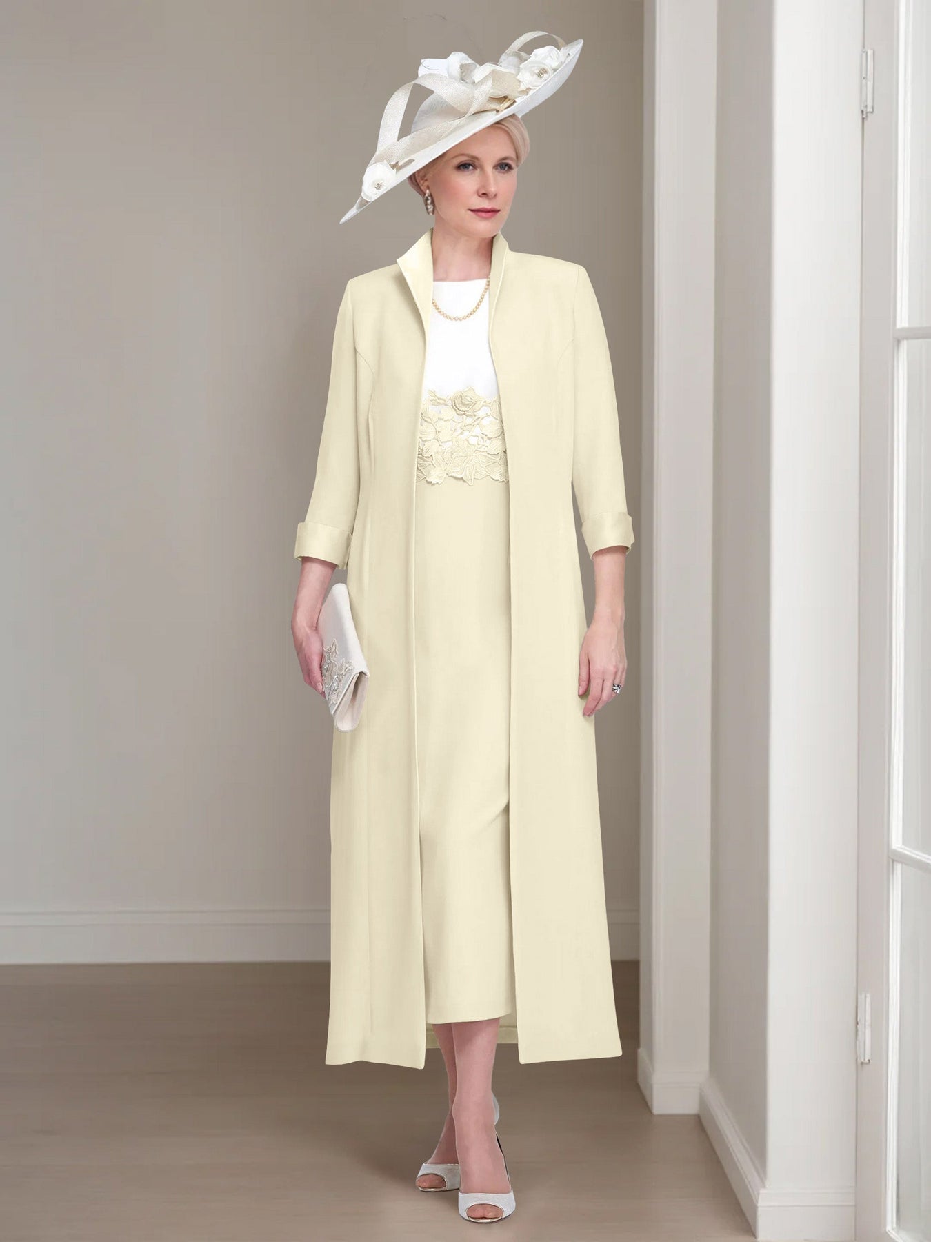 2 Pieces Round Neck Tea-Length Mother of the Bride Dresses with Jacket & Lace Appliques