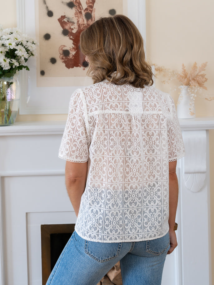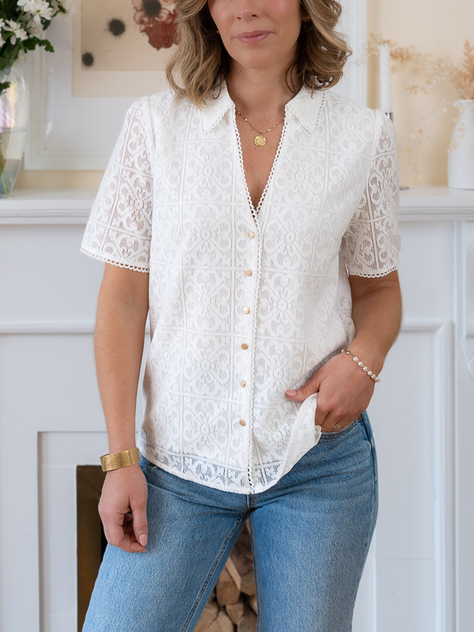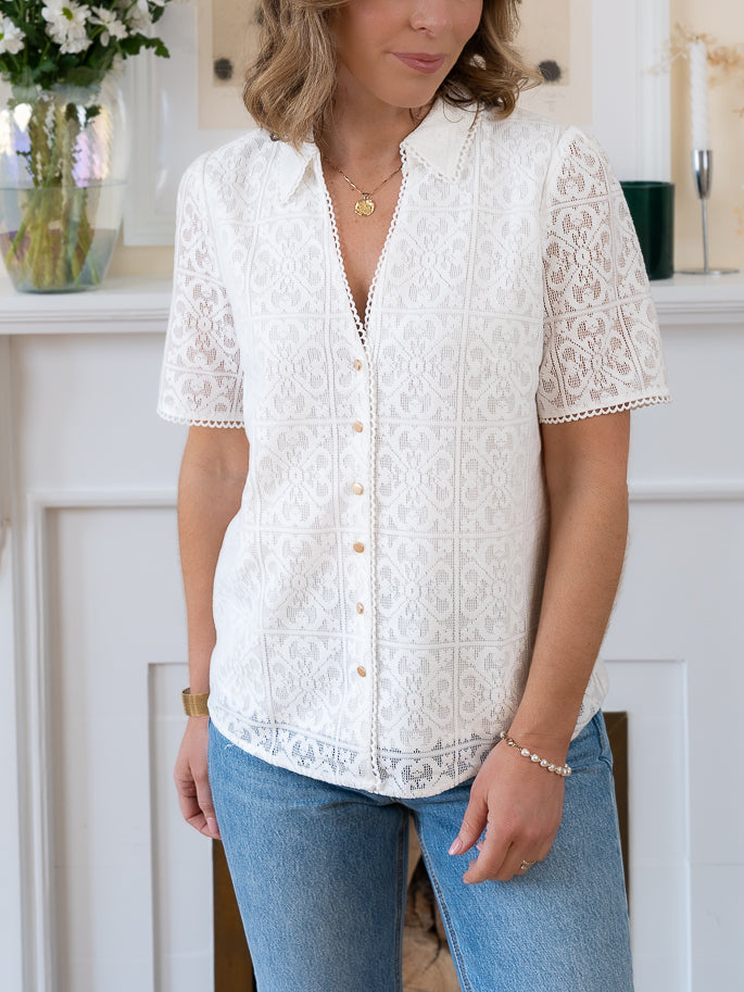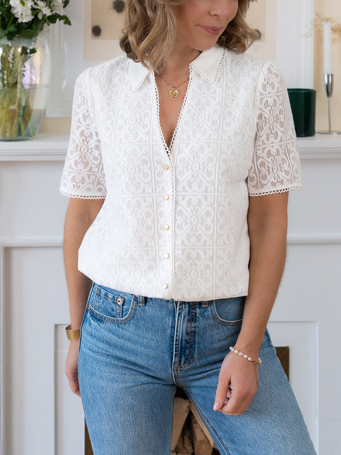 White short sleeved lace blouse with v neck and small collar. This top is partially lined.