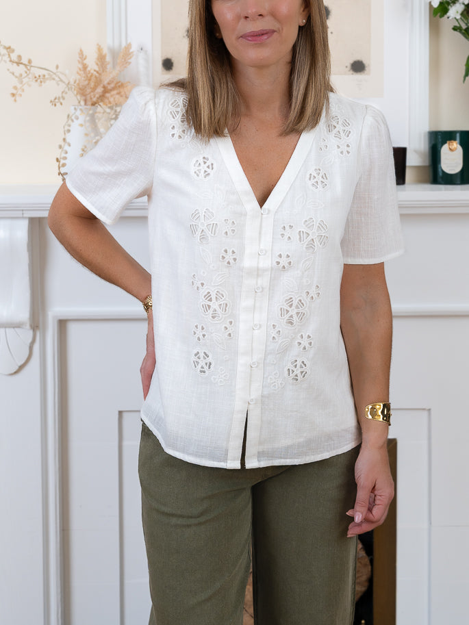 White linen blend short sleeved blouse with v neck and embroidery detail.